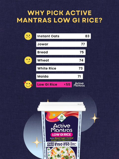 Active Mantras Low GI Rice can contribute to weight management by helping you feel fuller for longer, reducing cravings, and stabilizing blood sugar levels. By maintaining stable blood sugar levels, Low GI rice can also help regulate appetite and prevent energy crashes. This can indirectly support fat loss when combined with a healthy diet and regular exercise.