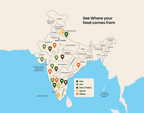 We choose farmers from varied agro-climatic zones of India & produce crops which are native to that particular place and also take consideration of the climatic conditions and soil, which translates into quality produce.