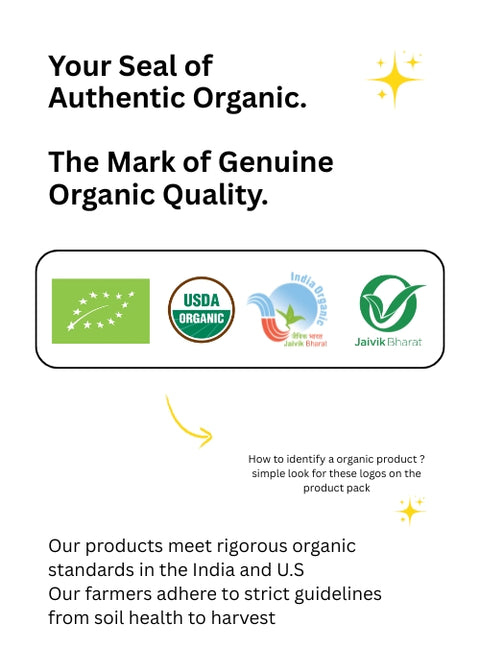 We are compliant with the National Programme for Organic Production (NPOP)—Indian Organic Standards and the National Organic Program (NOP) – US Organic Standards. Additionally, we meet FSSAI regulatory requirements for India and FDA regulations for exports.