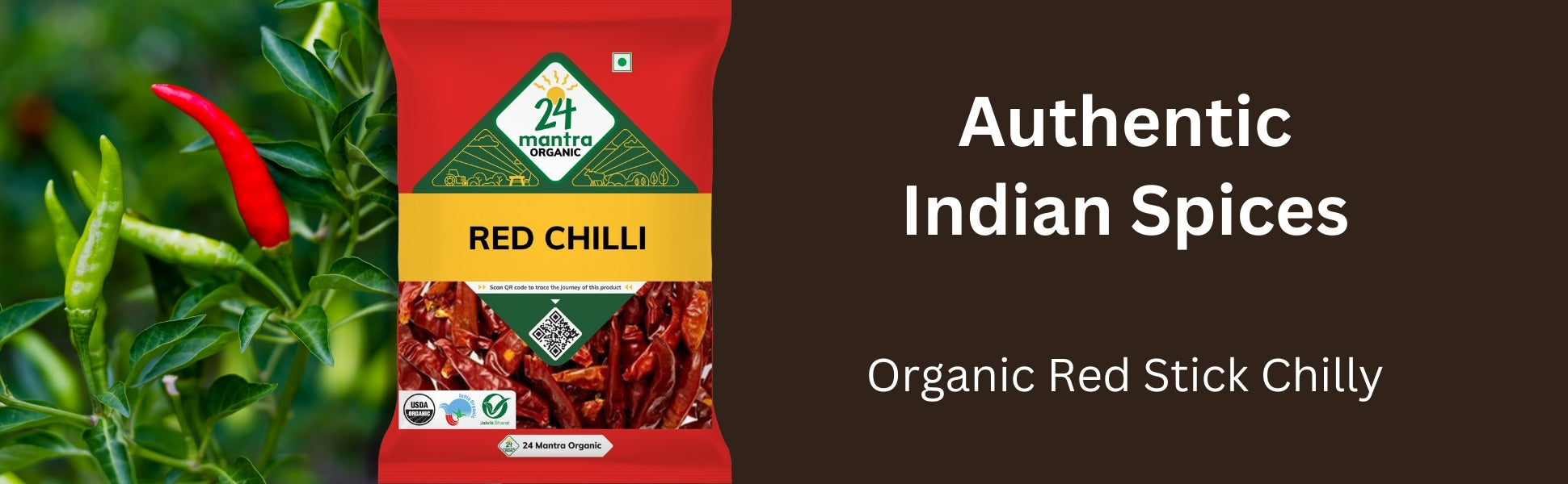 These whole Red Stick Chillies, cultivated organically in Tamil Nadu and Andhra Pradesh, are sun-dried to preserve their deep color and bold heat. Use them for tempering or grinding to make your own spice blends.