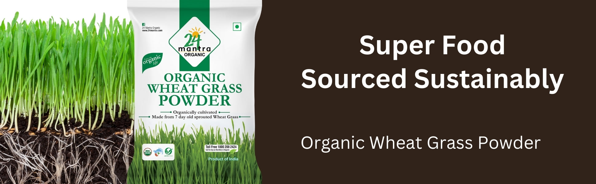 24 Mantra Organic Wheat Grass Powder is made from the 21-day young shoots of the wheat plant, a stage when the grass is at its nutritional peak. This vibrant green powder is a natural source of plant protein, fiber, and essential minerals, making it an excellent addition to your daily wellness routine.